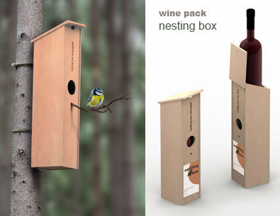 Today I found a great answer to this problem! Nestlin is a multifunctional wine packaging made from wood designed by Igor Solovyov: after using it to carry wine, it can be used as a bird nesting box, being therefore sustainable and earth friendly. There is also a little hole for you to insert a stick to create a perch for the birds. Cute!!